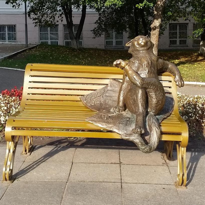 Вальяжно развалившись на лавочке, бронзовый котяра словно соблазняет туристов присесть рядом и сделать на память фото достопримечательности. Скульптура считается этаким шутливым символом города, и в Йошкар-Оле нет человека, который бы не погрелся рядом с ним на солнышке и не потер бы коту нос, на удачу.