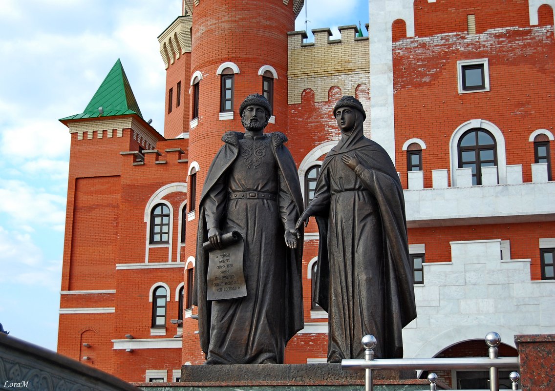 Еще одна популярная достопримечательность города, которая считается религиозной – это памятник Петру и Февронии, находящийся на Патриаршей площади. Установлен он в 2010 году. Окружает памятник роскошный подсвеченный фонтан.