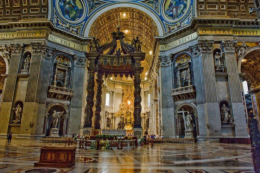 Собор Святого Петра главная католическая святыня Ватикана, над его архитектурными формами трудились лучшие мастера Ренессанса. Декоративные элементы относятся к стилю барокко и ранний Ренессанс.